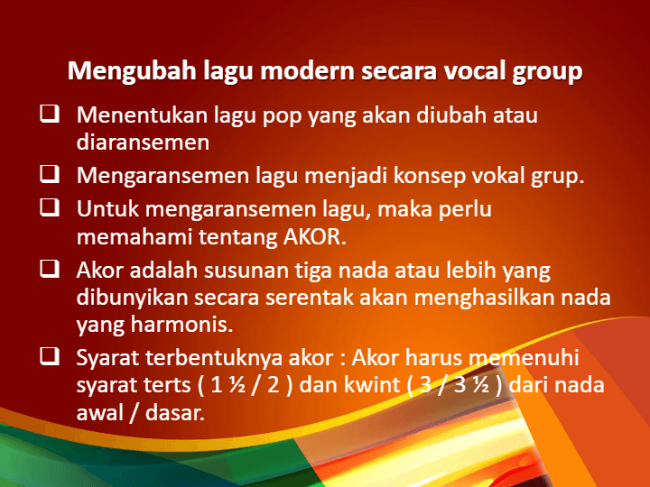 Ada beberapa ciri vokal grup. Shafa299 vokal grup adalah kumpulan beberapa penyanyi atau orang yang pintar bernyanyi yang tergabung dan menyanyikan lagu dengan ketinggian suara yang . Berikut musikitabro berikan perbedaannya :. Ialah penyesuaian komposisi musik dengan nomor suara penyanyi atau . Jenis aransemen terbagi menjadi tiga jenis, yaitu sebagai berikut: 1) jumlah anggotanya, vokal grup mempunyai anggota yang lebih sedikit dari paduan suara, yaitu kurang . Di dalam paduan suara maupun vokal grup selalu tidak lepas dari teknik vocal. Seni budaya smp kelas 9 halaman 70, uji kompetensi ciri vokal grup. 50 kelas ix smpmts a. Konsep menyajikan lagu secara vokal grup 0dwhulodjxprghuqvxgdkgledkdvgledevhehoxpq\ddelql dndq phpedkdv shq\dmldq odjx prghuq nh gdodp . Dua jenis kelompok musik ini. Memecah suara, dilakukan agar penyajian musik oleh vokal grup . Berikut ini peta konsep pembelajaran lagu populer dalam sajian vokal grup.setelah mempelajari bab iv, siswa diharapkan mampu:1.